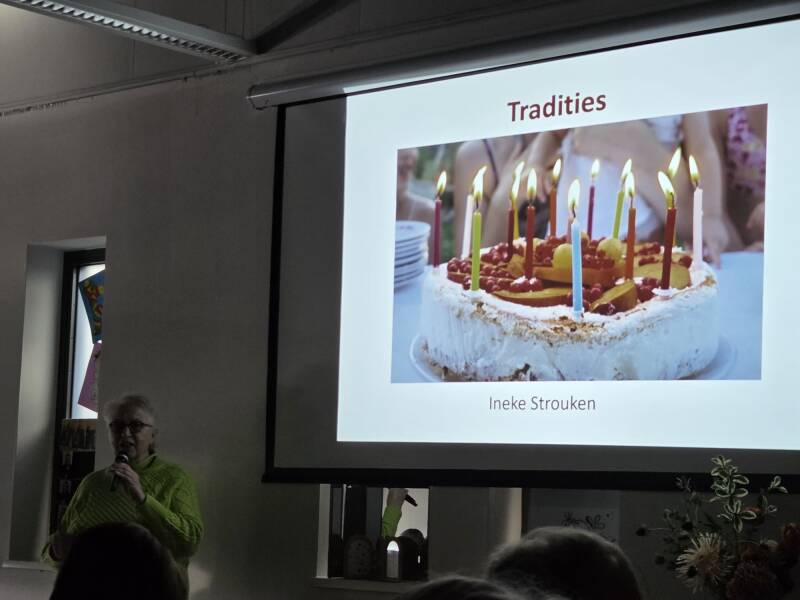 Op 4 februari gaf Ineke Strouken een lezing over tradities, een onderwerp waar ze al haar hele leven onderzoek naar doet en over publiceert. Iedereen heeft tradities! Alleen ben je je daarvan meestal niet bewust. Pas als anderen vragen waarom doe je zo, dan ga je erbij nadenken. Dat gebeurde met Sinterklaas, of nog beter met Piet. Wie kon toch iets hebben tegen zo'n onschuldig kinderfeest. We vielen bijna van onze stoel van verbazing. Tradities heb je zelf (bijvoorbeeld elke week friet eten bij moeder) en tradities deel je met anderen (carnaval vieren bijvoorbeeld). Tradities zijn gebruiken die je van generatie op generatie doorgeeft. Dat kunnen normen en waarden zijn, omgangsvormen (iemand aankijken als je tegen iemand praat), ambachten, feesten en levenslooprituelen (ringen wisselen met een huwelijk). Van veel tradities kennen de meeste mensen de historische achtergrondverhalen niet meer. Waarom zetten we een kerstboom met kerstmis, waarom is Nederland een fietsland? Tijdens de hele lezing vertelde Ineke de geschiedenis van tradities die wij allemaal herkennen. Te veel om op te noemen. Een voorbeeld: de beschuit met muisjes was eigenlijk niet bedoeld voor de kraamvisite, maar voor de kraamvrouw. Anijszaadjes wekken de moedermelk op, dacht men. De speculaasvrijer of het zakje chocolademunten verwijst naar de traditie om met Sinterklaas een meisje ten huwelijk te vragen. De chocolademunten zijn bedoeld als bruidsschat. Ineke ging extra in op Carnaval, een hele oude traditie, waar heel veel over te vertellen is.